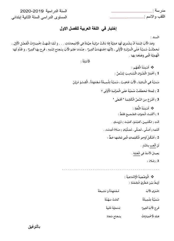 اختبارات الفصل الاول في مادة اللغة العربية للسنة الثانية ابتدائي