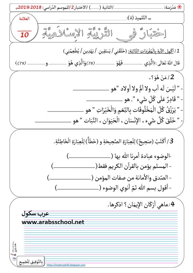 اختبار في التربية الاسلامية للسنة الثانية ابتدائي الفصل الثاني 2018 2019ا الجيل الثاني