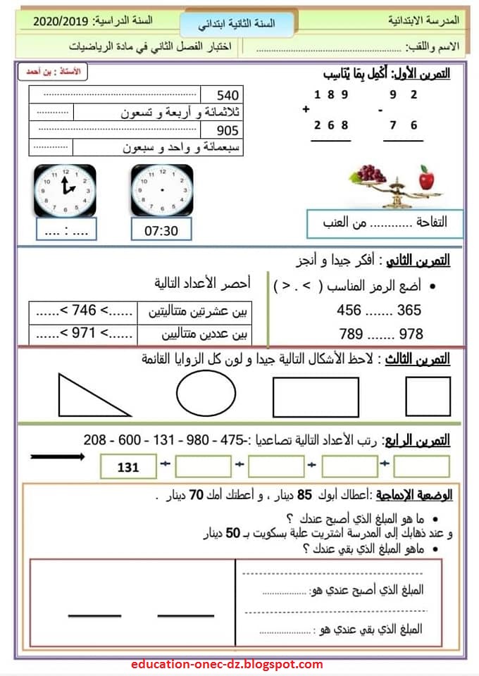 الامتحان الاول في مادة الرياضيات للسنة الثانية ابتدائي الجيل الثاني 2019 2020
