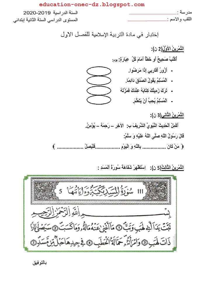 الاختبار رقم 1 في التربية الاسلامية للسنة الثانية ابتدائي الجيل الثاني