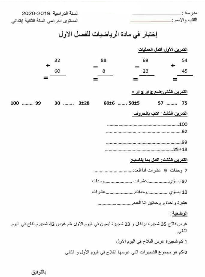 اختبارات الفصل الاول للسنة الثانية ابتدائي
