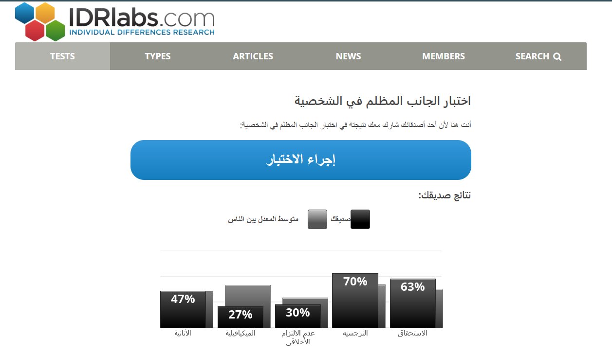 إن اختبار الجانب المظلم من الشخصية من idrlabs idr dcpt هو ملك لـidrlabs international. مقارنة مع النتائج الوسطية للناس. All non english versions of the website contain unofficial translations contributed by our users they are not binding in any way are not guaranteed to be accurate and have no legal effect. The official text is the english version of the website.