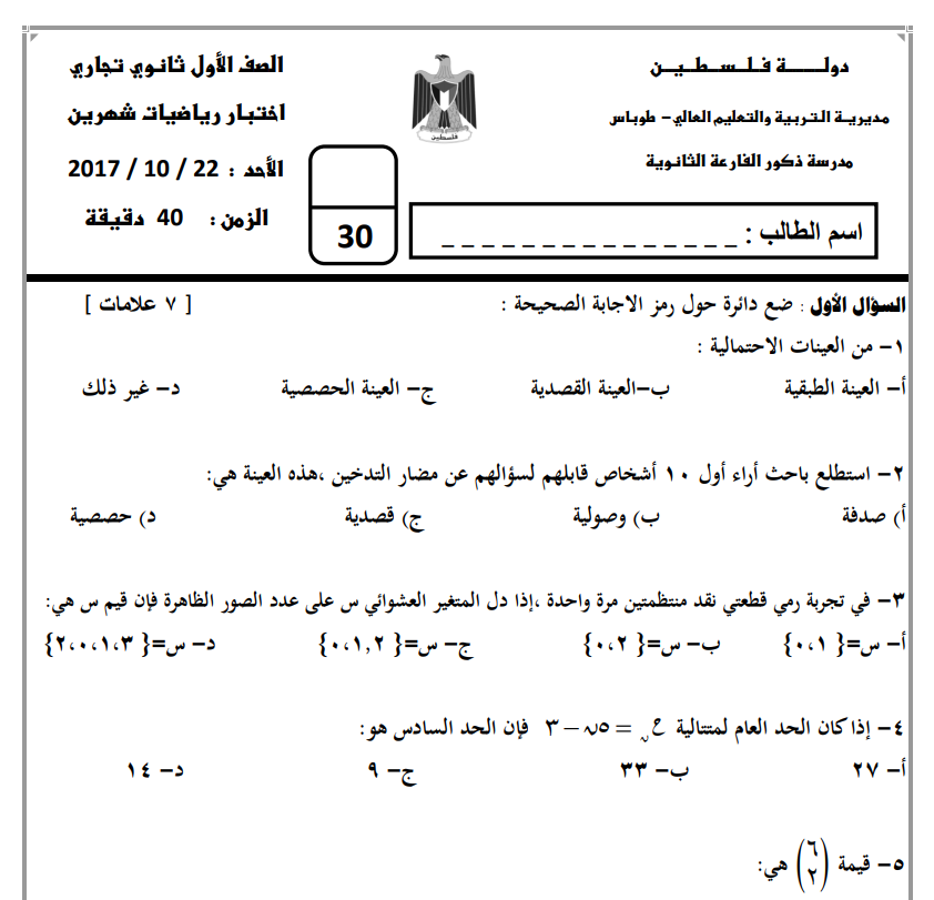 امتحان الشهرين رياضيات نصف الفصل الاول للصف الاول ثانوي الفرع لتجاري المنهاج الفلسطيني الجديد