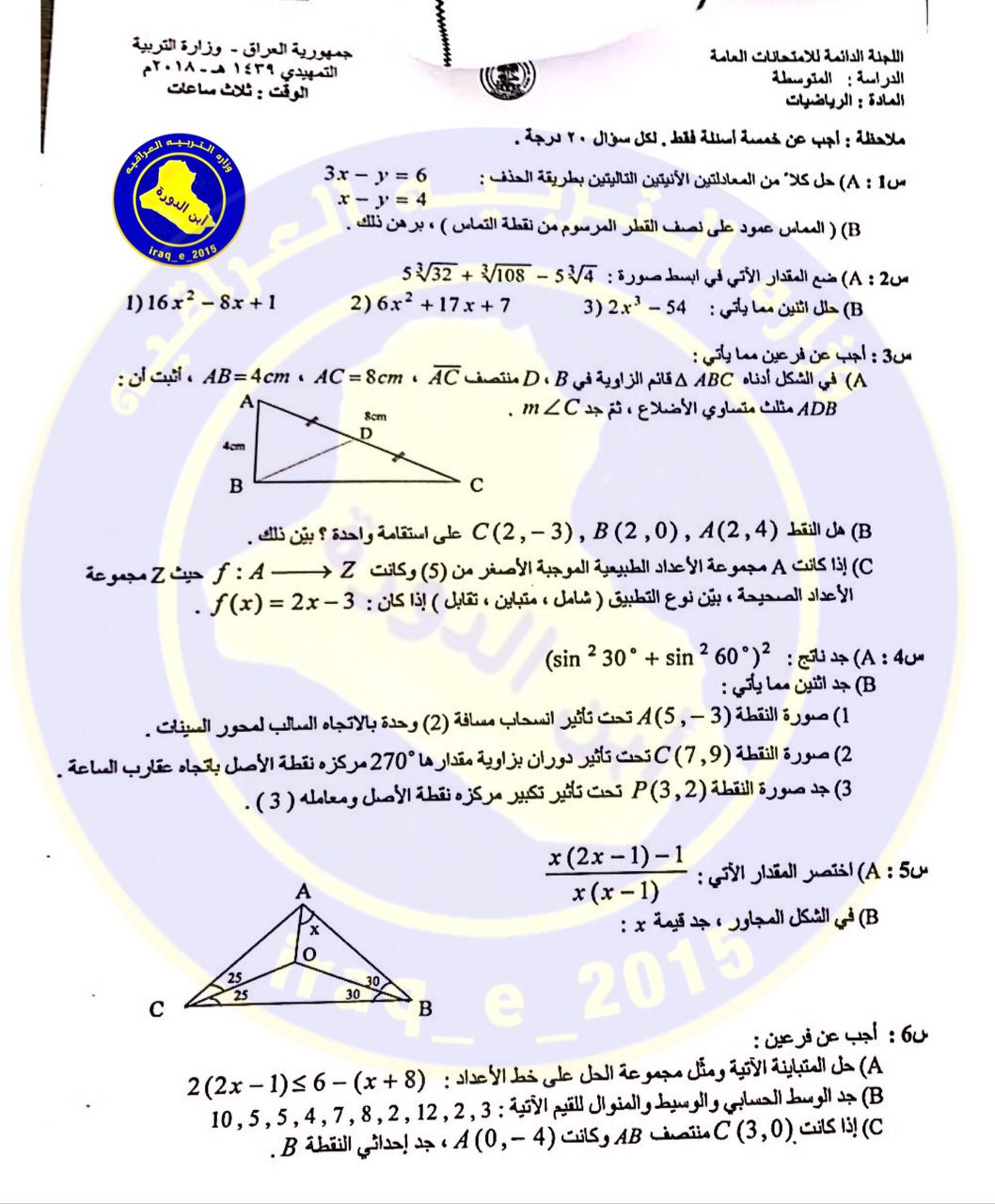 اسئلة مادة الرياضيات للصف الثالث المتوسط مع الأجوبة امتحانات التمهيدي الخارجية 2019