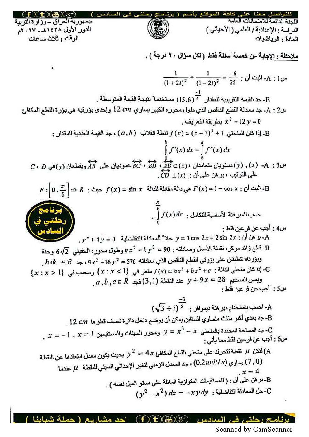 اسئلة الرياضيات للصف السادس الادبي نازحين الموصل 2017 الدور الاول هاشتاك نت