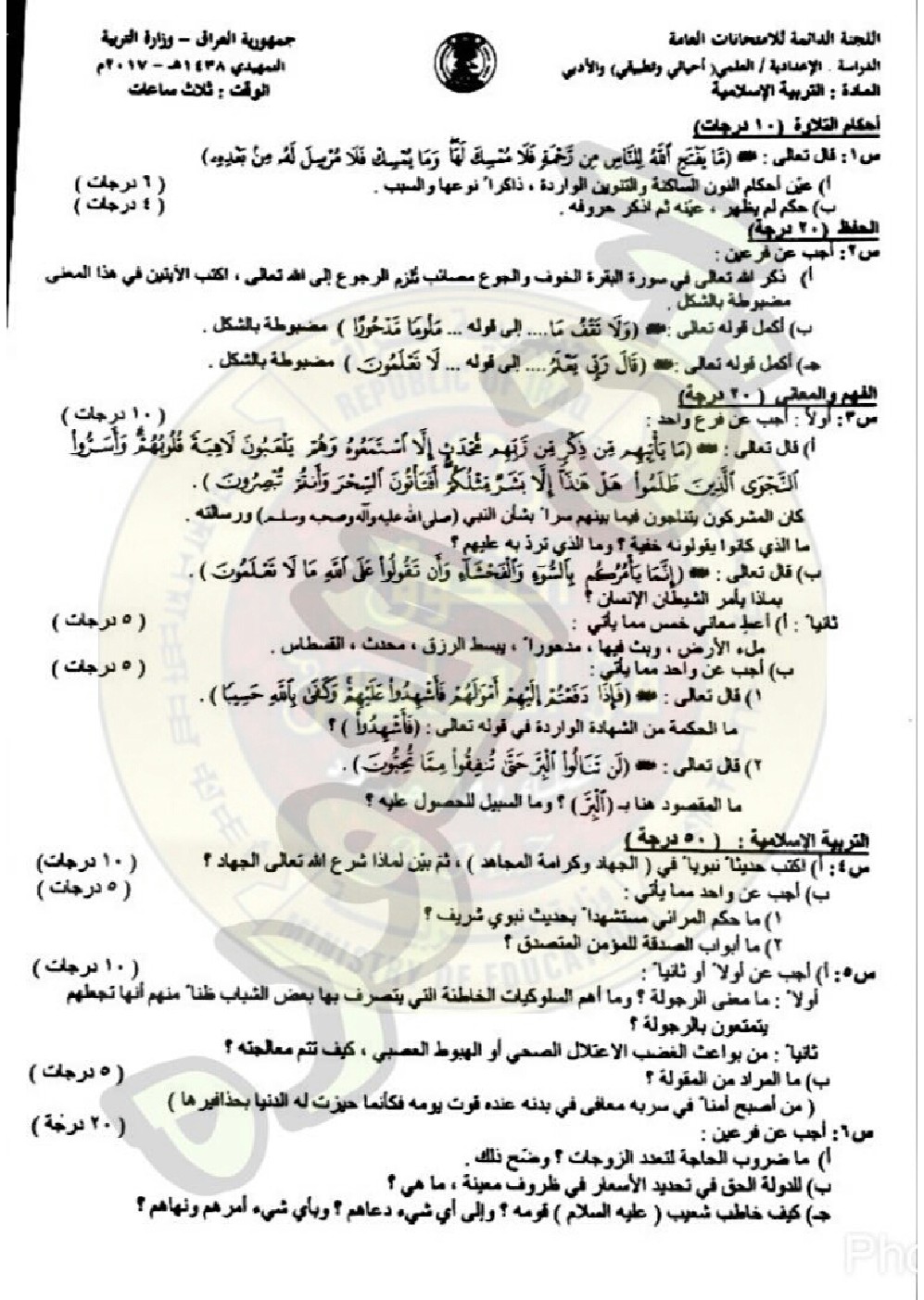 اسئلة امتحان التاريخ للصف السادس الأدبي في نينوى 2017 الدور الأول شبكة طلابنا لخدمة الطالب العراقي
