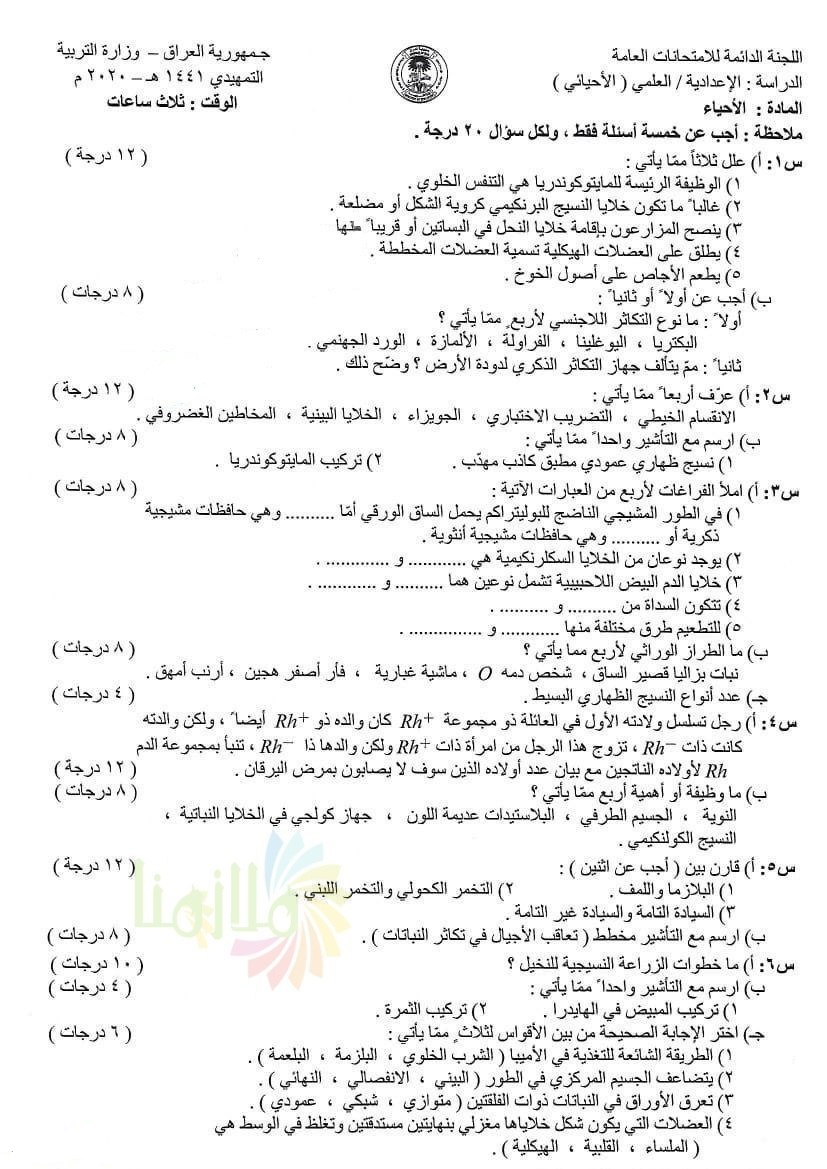 اسئلة اللغة العربية للصف السادس علمي أحيائي تطبيقي تمهيدي 2020 Youtube
