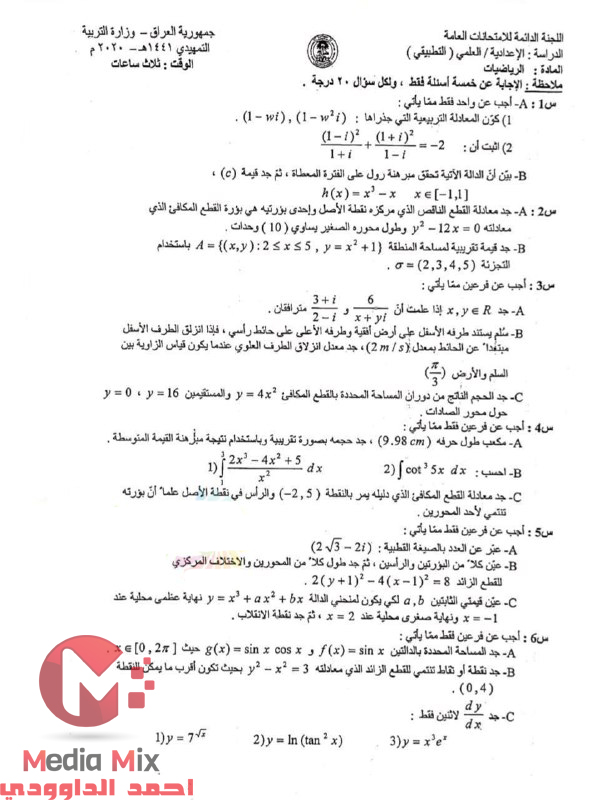 حل اسئلة رياضيات للصف السادس علمي تطبيقي 2020 الدور الاول