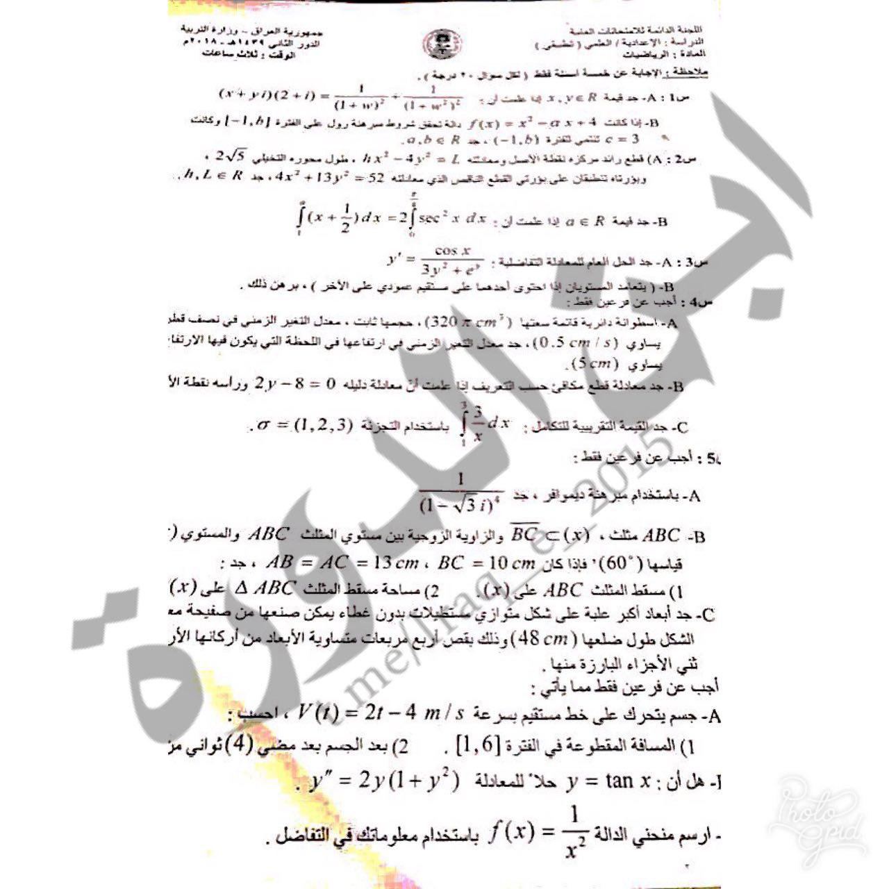 اسئلة الرياضيات الدور الثاني ٢٠١٨ سادس طلبة العراق 2018 Facebook