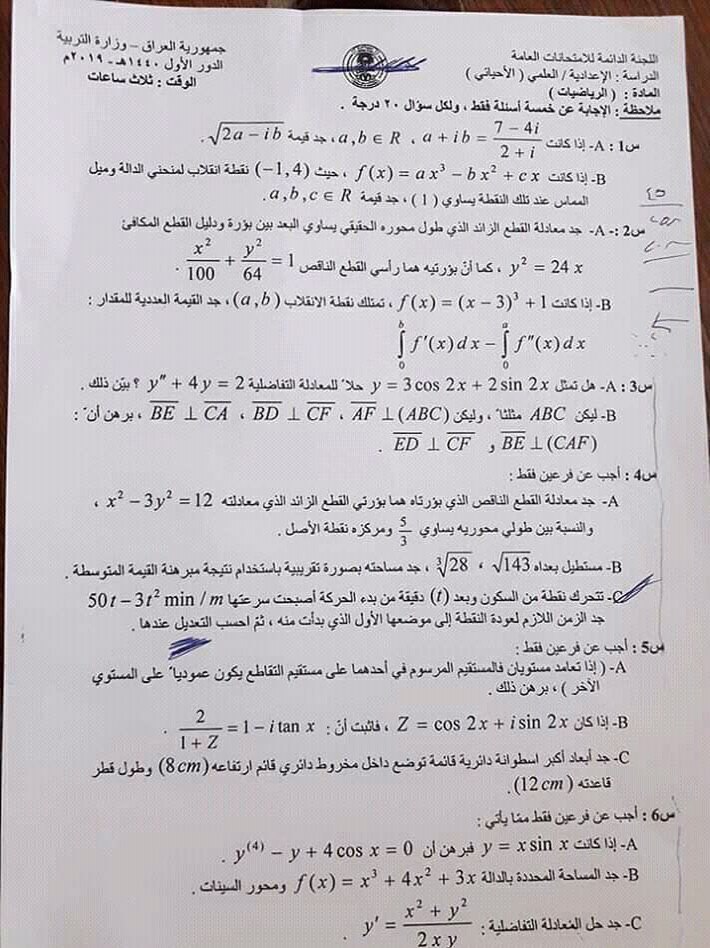 اسئلة الرياضيات للصف السادس الاحيائي خارج القطر واقليم كردستان الدور الاول 2019