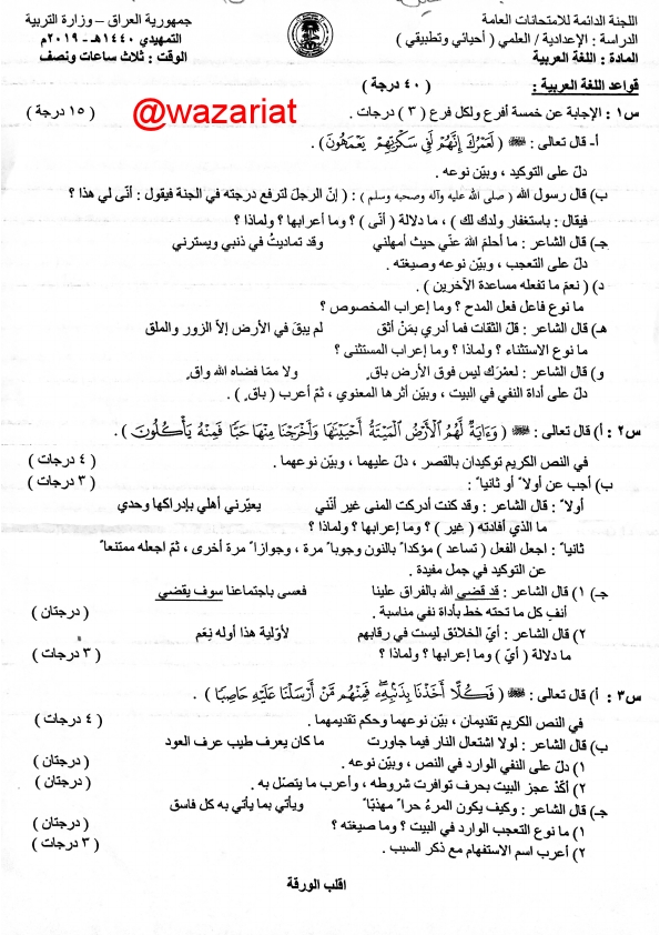 الاجوبة النموذجية اسئلة العربية التمهيدي السادس العلمي الاحيائي والتطبيقي 2019