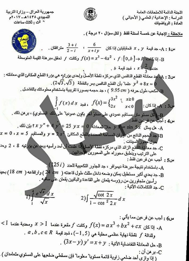 اسئلة الرياضيات للصف السادس العلمي الاحيائي التمهيدي 2017