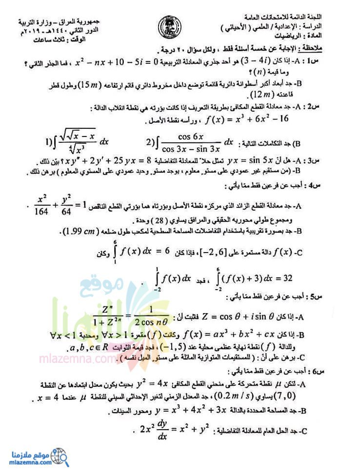 اسئلة الرياضيات للسادس الاحيائي 2019 الدور الثاني ملازمنا