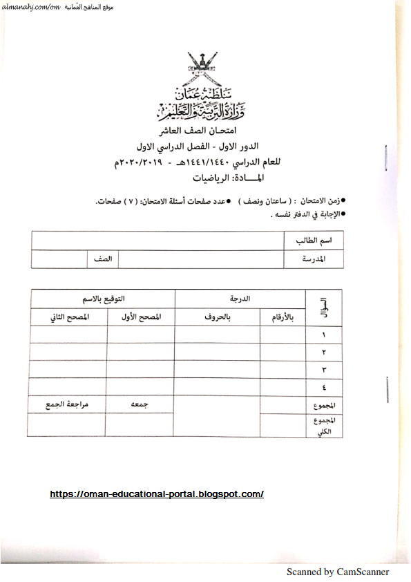 نمودج اجابة اختبار مادة الرياضيات للصف العاشر الفصل الاول الدور الاول 2019 2020