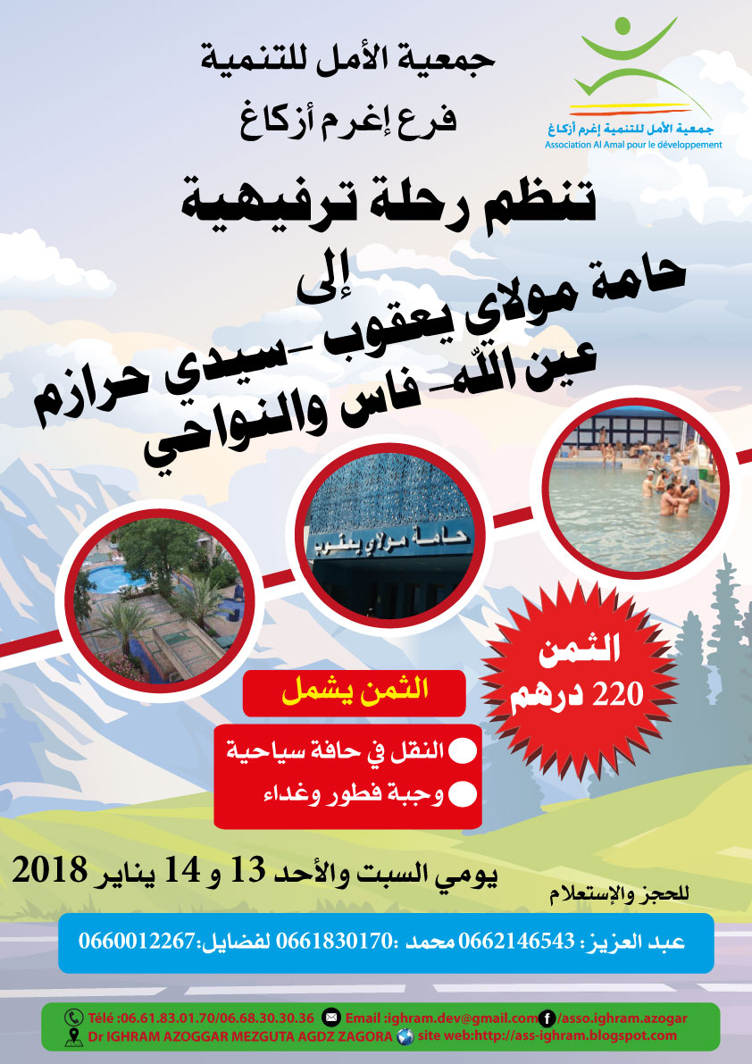 اعلان عن رحلة 2018 الى حامة مولاي يعقوب شهر يناير جمعية الأمل للتنمية فرع إغرم أزكاغ