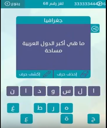 حل لغز ما هى اكبر الدول العربية مساحة من لعبة وصلة المجموعة الثامنة لغز رقم 68 صقور الإبدآع