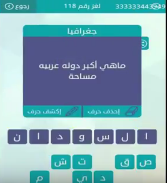 حل سؤال ماهى اكبر دولة عربية مساحة لغز رقم 118 من لعبة وصلة فى المجموعة الرابعة عشر صقور الإبدآع