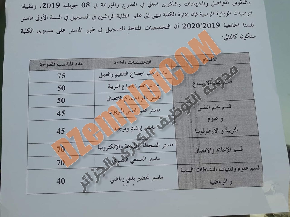 قائمة التخصصات وعدد المناصب المفتوحة في الماستر للسنة الجامعية 2019 2020 مدونة التوظيف الكبرى بالجزائر