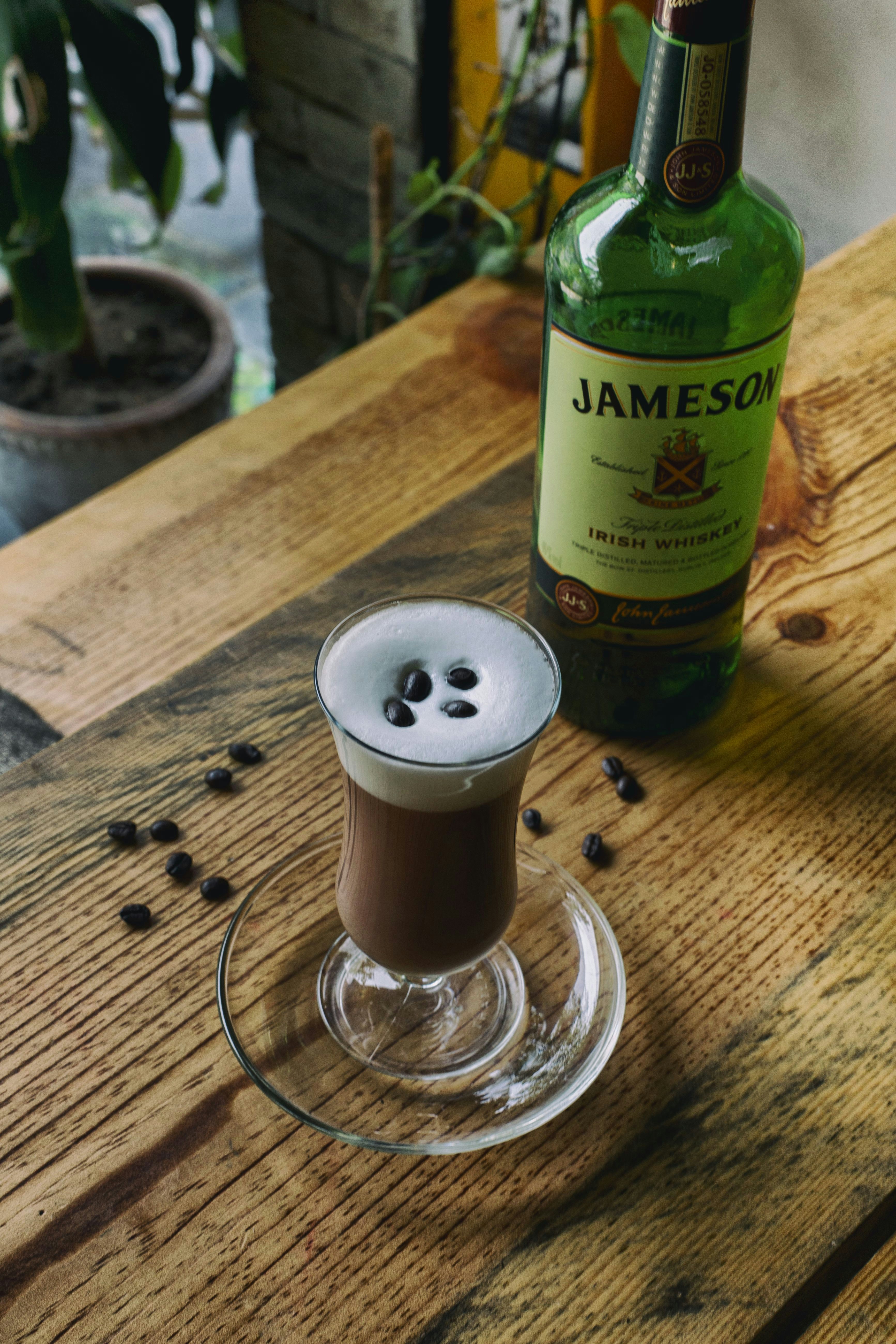Filled Wine Glass And Jameson Bottle On Brown Table Photo Free Beverage Image On Unsplash